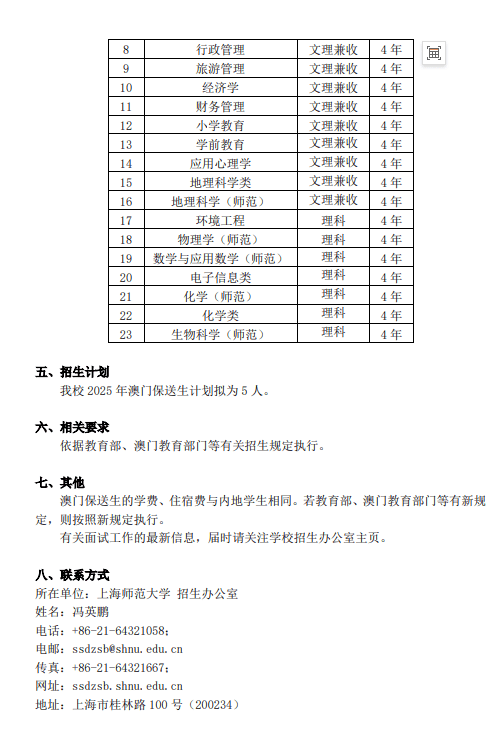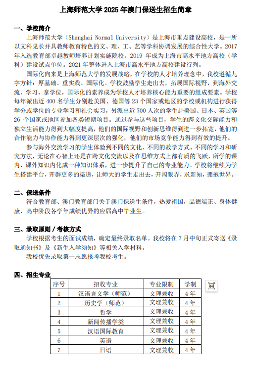 上海师范大学2025年招收澳门保送生简章